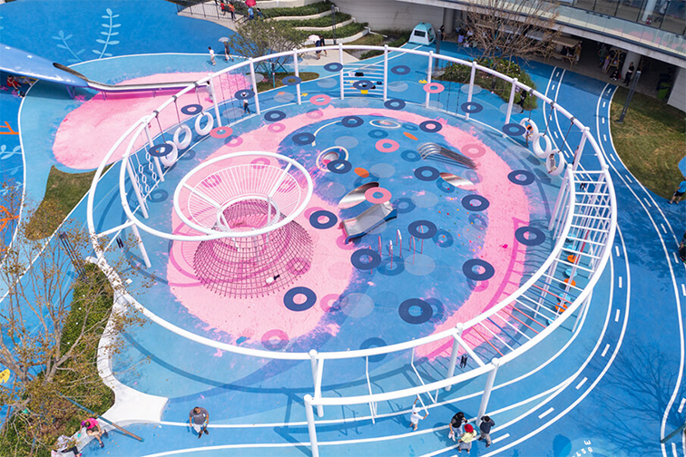这是一款以 “月亮与星空” 为设计灵感的沉浸式户外游乐设施,整体采用梦幻蓝粉渐变配色,地面印着错落的星空圆环图案,营造出浪漫的宇宙氛围。