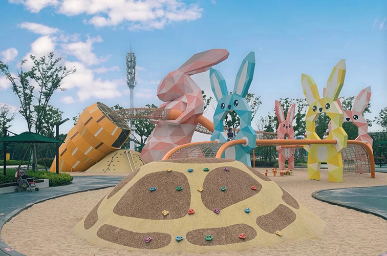 这是一款以几何萌兔与巨型胡萝卜为核心元素的沉浸式户外游乐设备,粉、蓝、黄等明快的马卡龙配色,搭配棱角分明的动物造型,打造出充满童话感的视觉效果。