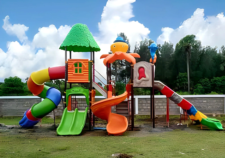 设备集多元游乐功能于一体:多条不同造型的滑梯(螺旋滑梯、直滑梯、波浪滑梯)满足多样滑行体验,攀爬网、钻行通道与互动面板可锻炼孩子的肢体协调力与探索欲,开阔的平台设计也为社交互动提供了空间。它采用环保耐用的户外材质,全圆角安全设计保障游玩安全,适合安置在社区公园、亲子乐园、文旅营地等场景,既能让孩子在充满热带风情的游乐场景中释放活力,也能凭借鲜明的色彩与萌趣造型成为场地的吸睛打卡点。