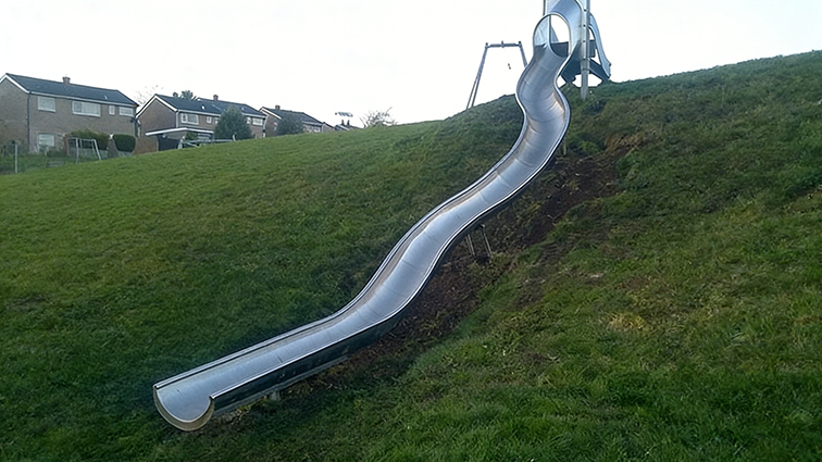 这是一款依托自然草坡地形打造的户外不锈钢滑梯,采用流畅的波浪形设计,银亮的金属质感与翠绿的草坡形成鲜明视觉对比,造型简约现代且与自然环境高度融合。