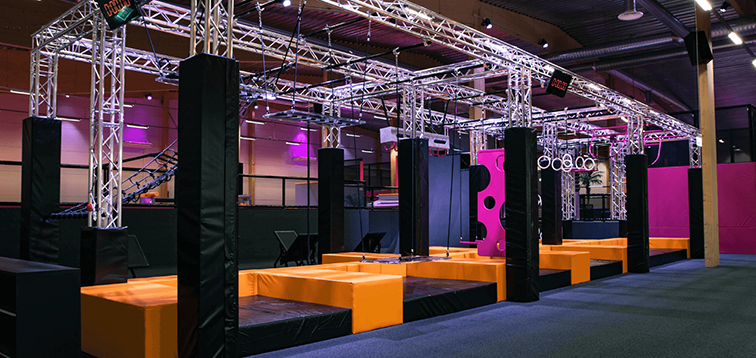这是一款专为追求刺激与竞技感的年轻客群打造的室内闯关游乐设备,以工业风钢架结构为骨架,融合吊环、悬挂平台、绳网攀爬、奶酪墙等经典忍者勇士关卡模块,搭配黑、橙、粉的撞色设计与霓虹灯光,整体如一座充满动感的极限挑战场,兼具硬核质感与潮流氛围。
