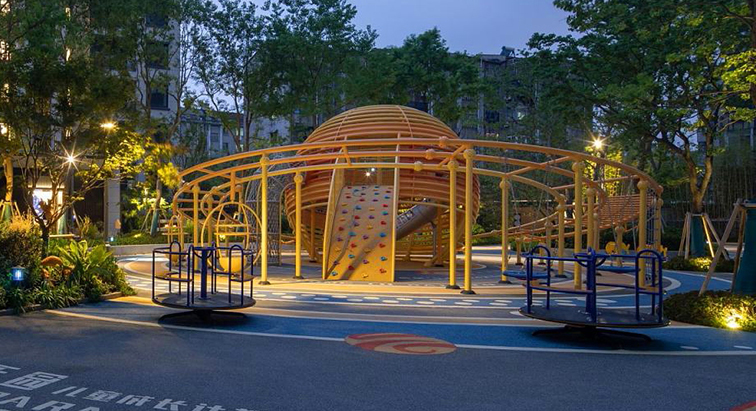 设备集多元游乐功能于一体:中心的球形攀爬网与攀岩墙可锻炼孩子的肢体力量与平衡感,内嵌的滑梯带来俯冲滑行的乐趣,外围的环形步道与旋转转盘则丰富了社交互动体验。它的夜间灯光设计不仅提升了游玩安全性,也让设备在傍晚后依然能成为场地的视觉焦点。