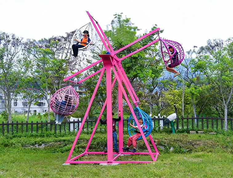 它采用旋转升降设计,游客坐在吊篮中随风车结构缓缓旋转、轻幅升降,既能体验微风拂面的松弛感,也能以开阔视角欣赏周边自然景致,适配全年龄段游客,尤其受亲子、闺蜜及年轻打卡群体喜爱。设备采用坚固的钢结构支架与防滑吊篮,搭配安全卡扣,无复杂电力驱动,维护便捷,适合安置在亲子乐园、郊野营地、网红打卡地等场景,既能凭借超高颜值成为拍照出片的网红点,也能以轻松治愈的体验吸引客流,是打造沉浸式游乐场景的热门项目。