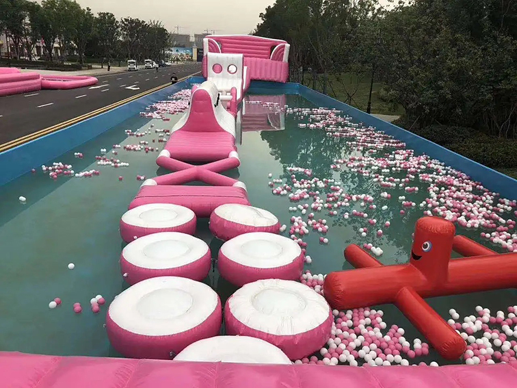 这是一款以粉白撞色为核心的充气水上闯关设备,整体造型如梦幻的粉色水世界,包含天鹅造型滑梯、圆饼浮台、波波球池及红色卡通障碍模块,视觉上充满少女心与童趣,打卡出片率极高。