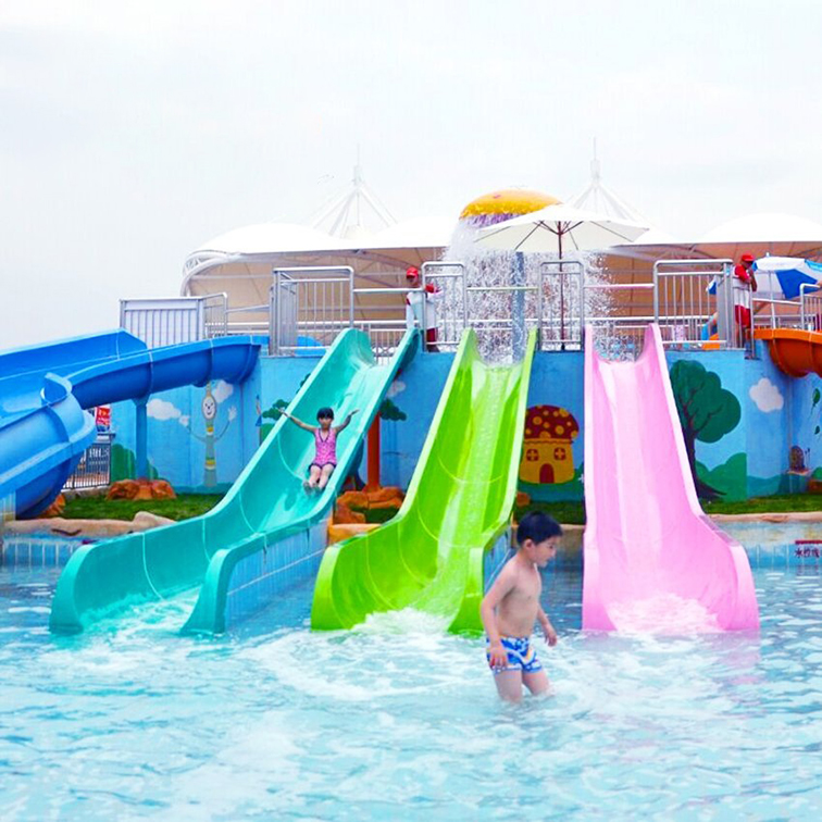 不同坡度的滑道满足不同胆量孩子的需求:平缓的粉绿滑道适合初次体验的低龄儿童,稍陡的蓝绿滑道则能让孩子感受轻速滑行的乐趣,全程水流缓冲大幅降低磕碰风险。家长可在浅水区陪同互动,既是消暑嬉水的欢乐场,也是亲子陪伴的温馨空间。