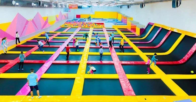 这是一款集运动、娱乐、社交于一体的大型室内蹦床设备,以黄、红、粉等活力色彩的模块化蹦床为核心,搭配自由蹦跳区、灌篮区、海绵池、躲避球区等多元功能分区,整体布局如一片充满动感的彩色星阵,适配全年龄段游客,尤其受青少年与亲子家庭青睐。