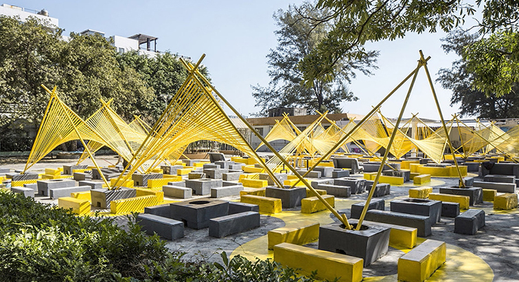 这是一款兼具休憩与互动功能的公共艺术景观装置,以黄色张拉膜结构为视觉核心,搭配黄灰撞色的几何模块化座椅,整体造型如散落于户外的金芒织阵,视觉上充满现代艺术感与活力。